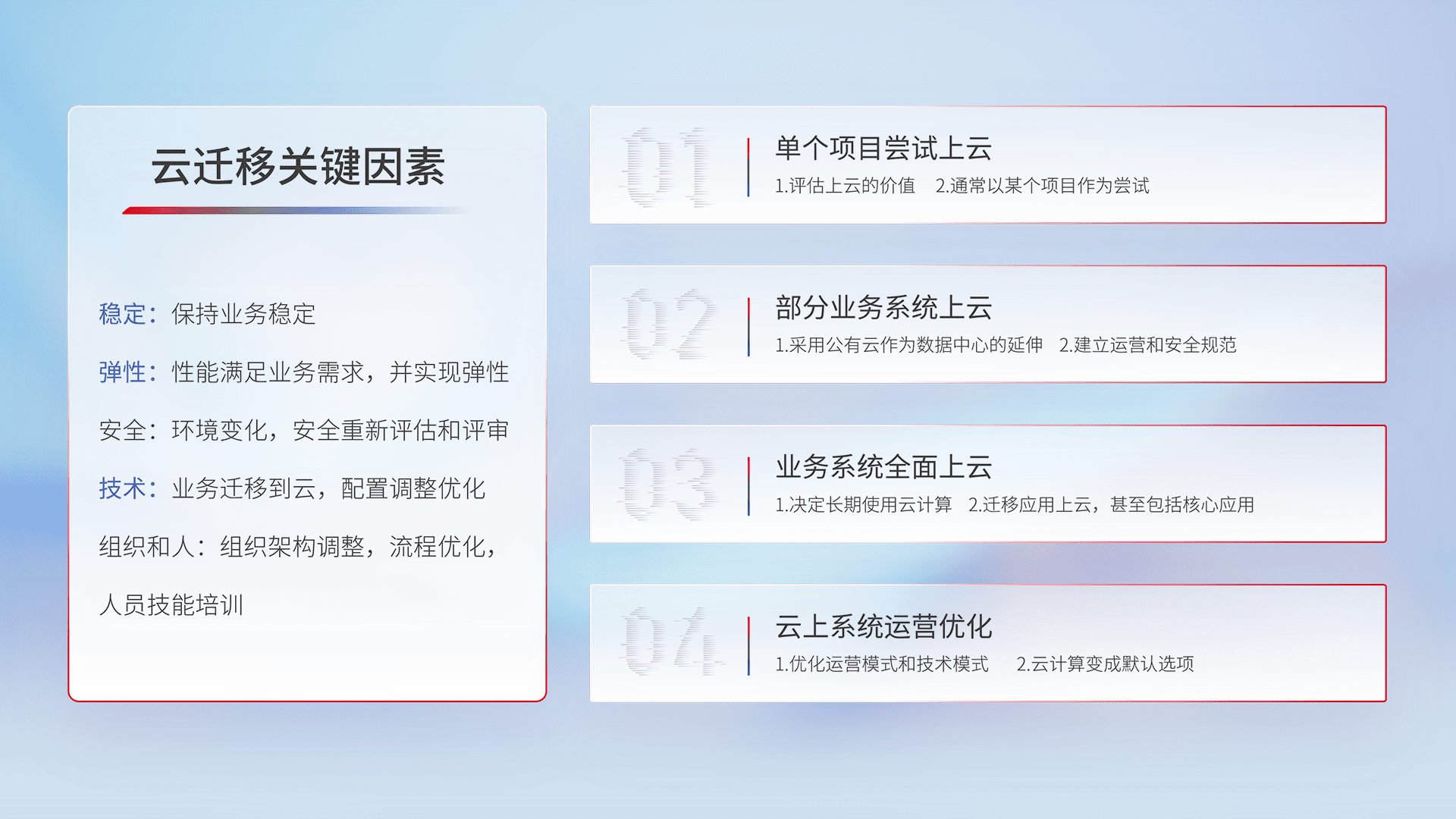 结合实际业务,,,从规划设计、、云平台选型、、云原生改造、、、、数据迁移、、、、集成交付,,,,迁移全过程为客户识别最佳上云路径,,,,做好风险识别管理,,设计网络架构、、、身份权限、、、、安全审计合规、、操作审计、、、、日志审计、、监控告警策略、、、、多站点容灾设计等,,,对云上基础设施进行整体规划,,提升IT治理水平,,,,以满足弹性、、、高可用、、、高性能的需求。。。