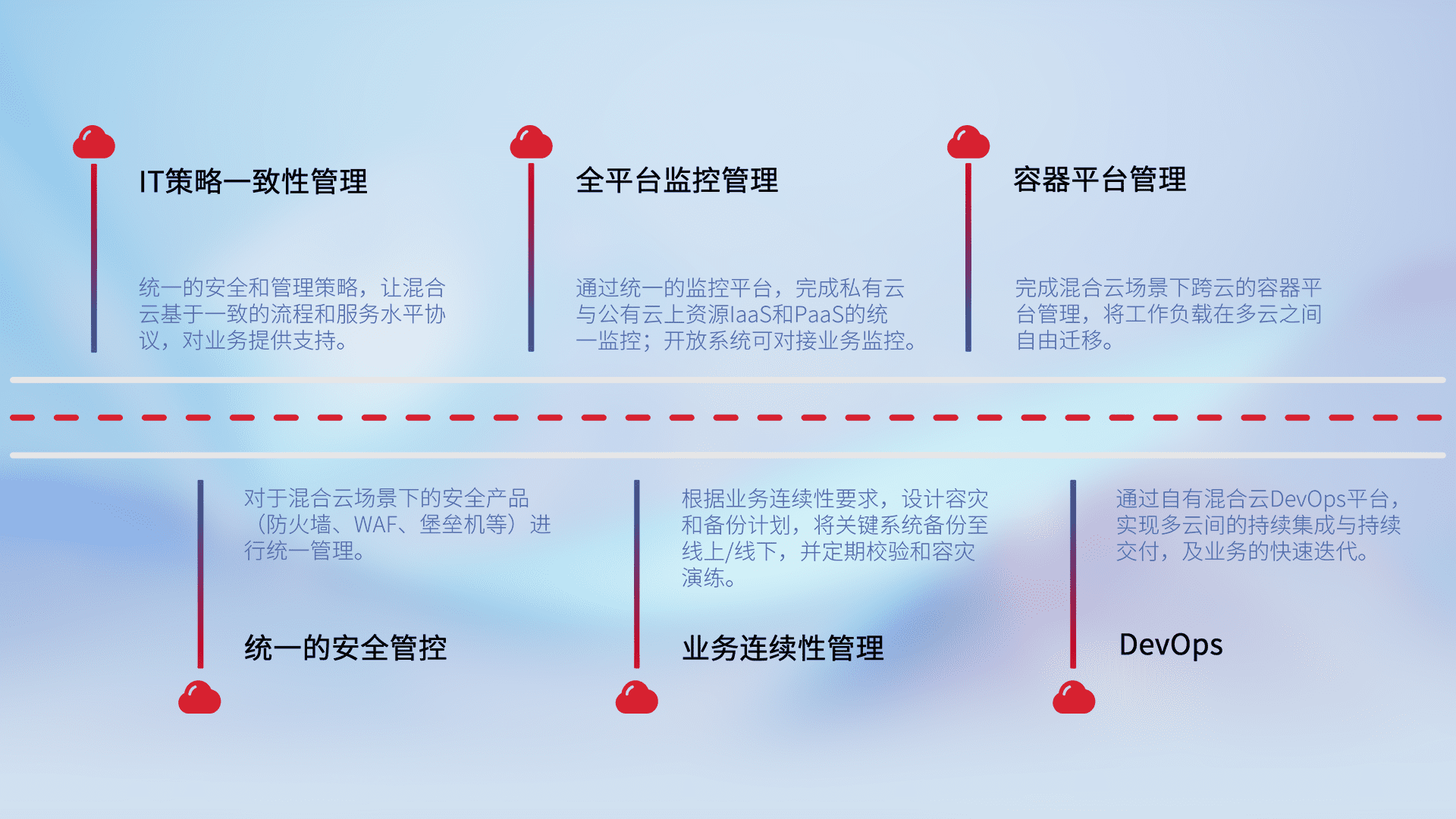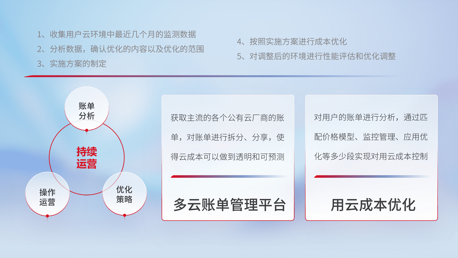 通过多云纳管,,以统一的资源数据模型把客户的云资源进行抽象和封装,,,进而实现对多云资源的统一操作,,,保障云资源管理的可靠性、、、、稳定性与可用性。。量身定制化运维内容,,配置、、、、开发运维、、补丁管理、、、备份、、、、监控、、认证和访问管理、、、审计和日常巡检等,,,保障在用云过程中的可靠度,,稳定度以及高可用率。。。