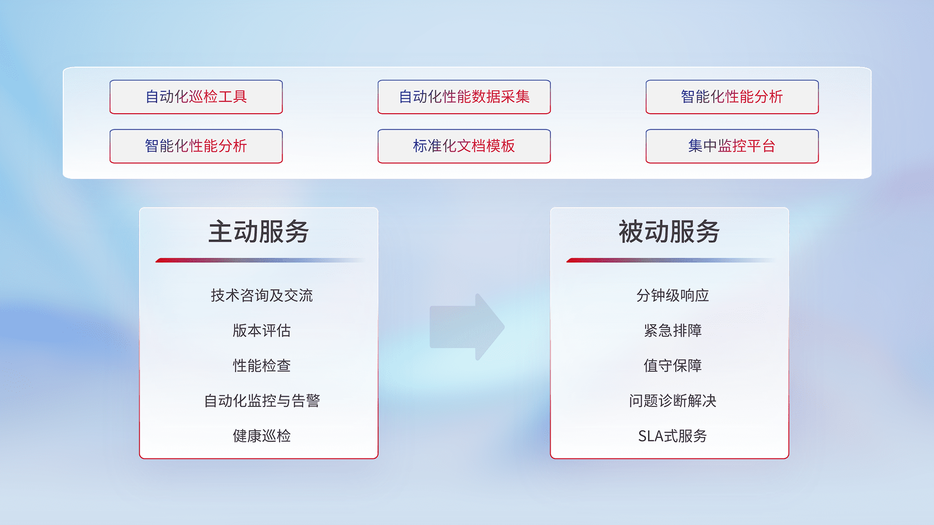 智能化工具和标准化文档,,,,保障服务质量,,,,提供主动服务(包含技术咨询、、、、版本评估、、、、性能检查、、自动化监控与告警、、、、健康巡检)和被动服务包含(分钟级响应、、、紧急排障、、、、值守保障、、、问题诊断解决、、、、SLA服务)。。。。