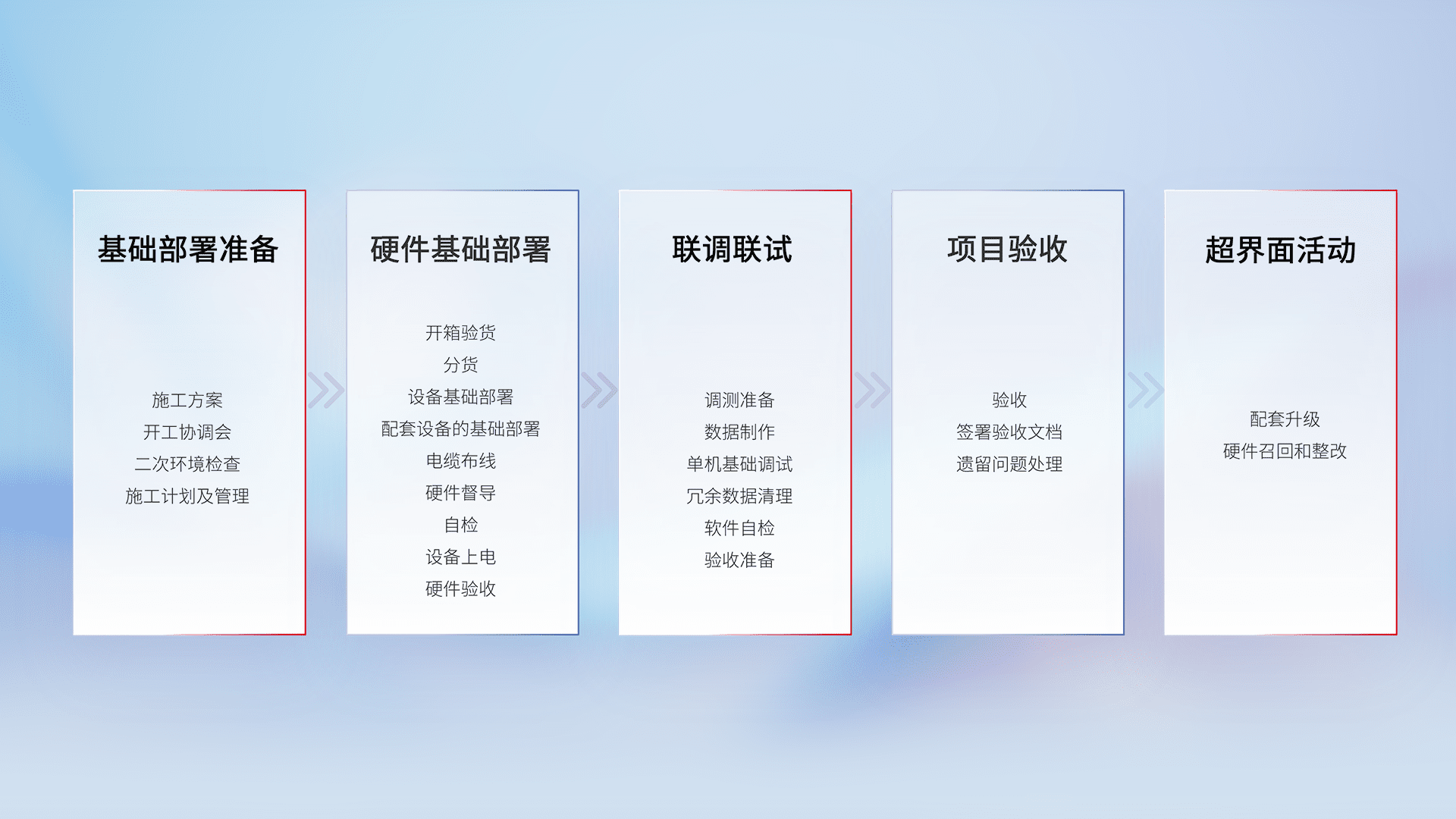 从基础部署准备、、、、硬件基础部署、、、联调联试、、项目验收、、、、越界面活动的全过程可追溯,,保证施工质量和进度。。。。